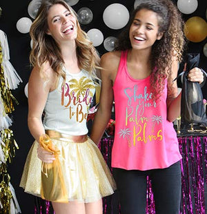 The bride will love this comfortable flowy tank top! The sheer racerback tank says BRIDE TO BE in a pretty ombre glitter graphic accented with a foil palm tree. Perfect for a Tropical Bachelorette Party.