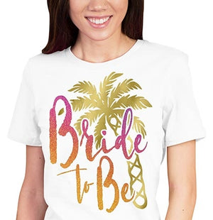 This t-shirt says BRIDE TO BE in a pretty ombre glitter graphic accented with a gold metallic palm tree. The top is a fantastic item for the bride to wear at a tropical bachelorette party or bridal shower--everyone will know that she's the star!