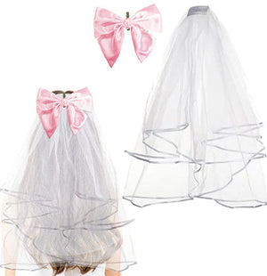 The bride will feel so girly with this Coquette Bachelorette Party accessories. The set comes with a 30" white veil and a satin blush bow. She can wear it at her bachelorette party, engagement party or bridal shower. The white two-layer tulle veil attaches using a single comb. The satin bow has an alligator clip that can clip onto the comb of the veil.