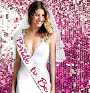 Our most fabulous pink bridal set! The set includes a hot pink glitter "Bride to Be" white sash and white tulle veil with white trim. The perfect hot pink set for the bride for her bridal shower, engagement party, or bachelorette party!