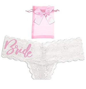 This sweet panty set is perfect to get the bride for a She's Tying the Knot bachelorette party or lingerie shower. The set includes a thong panty and organza bag. The white thong says Bride in a pretty pink lettering. The light pink organza bag is 4x6 and the panty fits perfectly inside making it the perfect gift.