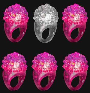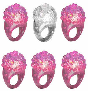 Putting together a goodie bags for a Coquette bachelorette party? These fun bumpy rings are perfect to include the bag. The jelly style rings will light up bright multi-colored lights when pressed. The set of six includes one clear for the bride and five light pink for the bridal party. This flashing ring is must for the bachelorette party! Please note to press hard to get the rings to light up.