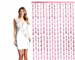 This Light Pink Penis Shaped Foil Curtain is great for a bit of naughtiness at a Coquette themed bachelorette party. The metallic foil curtain is 8 feet tall and 3 feet wide. It will fit standard doorways or create a fun backdrop to take pictures in front of.