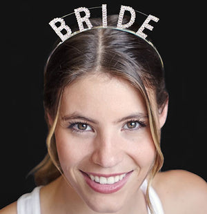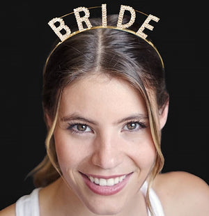 This adorable headband is a modern alternative to a Tiara! This silver or gold headband spells out BRIDE in real crystal rhinestones. Get it for any Bride to be to wear at the bridal shower or bachelorette party!