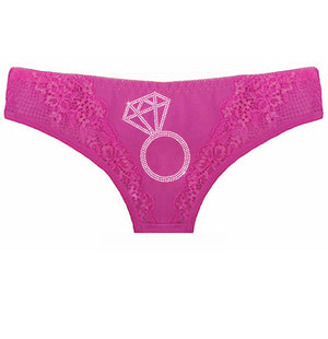 Give the bride panties at her bachelorette party or lingerie shower. The lace trimmed thong panties have a rhinestone ring icon on the front. She'll love wearing these for her spouse.