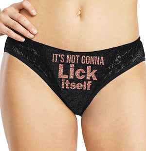 Give the bride naughty panties at her bachelorette party or lingerie shower. The lace trimmed thong panties say It's Not Gonna Lick Itself in a pretty rose gold glitter on the front. She'll love to nudge her spouse wearing these cheeky panties!