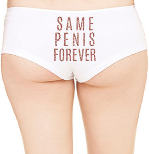Looking for some naughty panties for a Lingerie Shower or Bachelorette Party? These cheeky boyshort style panties say SAME PEN*S FOREVER on the back in a pretty rose gold glitter.