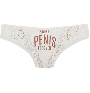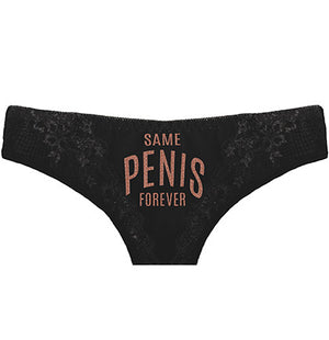 Give the bride panties at her bachelorette party or lingerie shower. The lace trimmed thong panties say Same Pen*s Forever in a pretty rose gold glitter on the front.