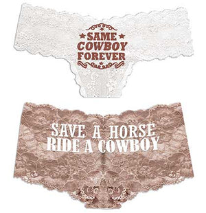 Is the bride having a Boots Before the Ring Lingerie Shower or Bachelorette Party? This panty set is a must have to gift the bride. The white panties say Same Cowboy Forever in brown and the taupe lace boyshort says Save a Horse Ride a Cowboy in white. Perfect for the cowgirl bride to wear for her cowboy spouse!