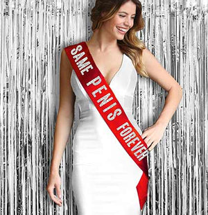 Have the Bride be the center of attention in this eye catching red satin sash. The bride will turn heads in our Same Pen*s Forever satin sash. Perfect for a Bachelorette Party or Lingerie Shower!