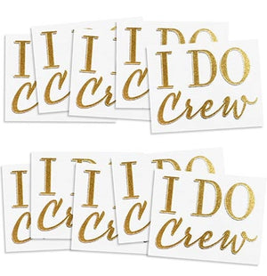 These temporary metallic gold tattoos make the perfect bachelorette party accessory for all your guests. These gold bachelorette tattoos say, "I Do Crew" or cut off the "Crew" and you'll have "I Do" for the bride! Easily applied with a damp soft cloth, this tattoo can be easily removed with rubbing alcohol. A fun party favor or photo prop for a Bachelorette Party!