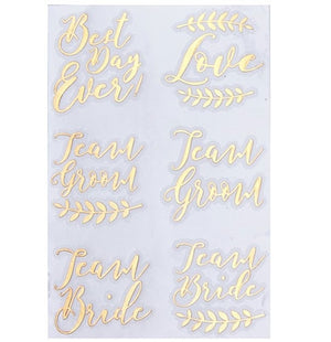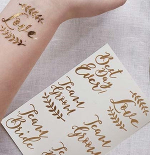 These temporary tattoos make the perfect bachelorette party accessory for all your guests. These rose gold tattoos say Best Day Ever, Love, Team Groom and Team Bride! Easily applied with a damp soft cloth, this tattoo can be easily removed with rubbing alcohol. A fun party favor or prop for Bachelorette Party photos!