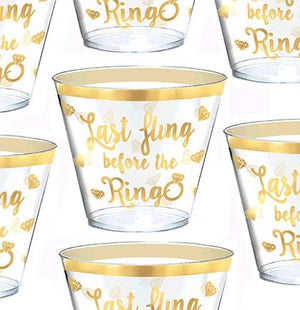 It's your LAST FLING BEFORE THE RING! These 9oz set of 30 plastic cups are clear with metallic gold. These cups are practical and cute and will work with any themed bachelorette party.