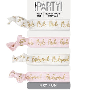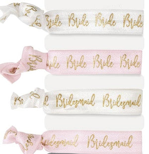 These Bachelorette Hair Ties are perfect to include in the bride and bridesmaid gift boxes. Included in the set of four is two Bride and two Bridesmaid one in each colorway. Perfect to wear running wedding errands, getting ready the day of the wedding or create hangover kits for after the bachelorette party.