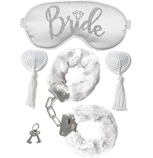 Get this fun gift set for the bride's lingerie shower or bachelorette party. The set includes a blindfold eye mask that says Bride accented with a diamond icon, a pair of heart shaped tassel pasties and a pair of fuzzy handcuffs (which comes with two sets of keys). The perfect set for an adventurous bride and her spouse.