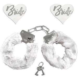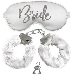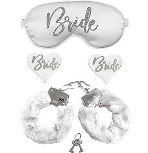 Get this naughty gift set for the bride's lingerie shower or bachelorette party. The set includes a blindfold eye mask that says Bride in silver lettering, matching heart shaped pasties and a pair of fuzzy handcuffs (which comes with two sets of keys). The perfect set for an adventurous bride and her spouse.