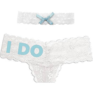 This panty and garter set will be amazing to get the bride for a Something Blue lingerie shower. The white panties say I Do in a pretty light blue accompanied by a white lace garter with a light blue bow. The bride will love this set for her wedding night or during the honeymoon.