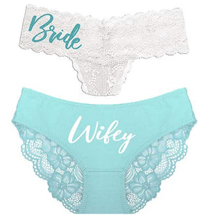 The bride will love this panty set in a trendy aqua colorway. The thong panties say Bride in aqua lettering and the bikini panties say Wifey in white lettering. The perfect gift set to get the bride for her bachelorette party or lingerie shower.