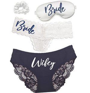Looking for a fun Something Blue to get the bride? This four piece panty set is perfect.  The set includes two panties, a sleep mask and a scrunchie. The lace trimmed bikini panty says Wifey in a pretty white font. The lace thong panty and sleep mask says Bride in a navy blue glitter. The thong panty is perfect to wear the day of the wedding and the bikini for the honeymoon.