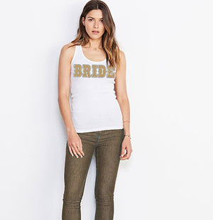 Has the bride been officially Wrangled for Life? This western white tank says Bride in sparkling gold glitter, accented with real crystal rhinestones for that extra bling. It’s the ultimate shirt for the Bride's Last Rodeo where the bride can kick up her boots and line dance straight into matrimony.
