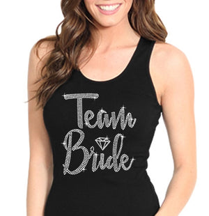Looking for the perfect shirt for your team to wear out to the bachelorette party? This cotton ribbed tank top says TEAM BRIDE in real rhinestones accented with a silver glitter diamond icon. Perfect for the team to wear to the bachelorette party.
