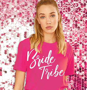Looking for hot and trendy bachelorette party ideas? Let's Bach Party is THE party to throw. Get the whole bridal party matching shirts with our magenta crew neck tshirt to party in. This hot colorway says Bride Tribe in a bold white graphic. The tribe will stand out in this fun tee while partying the night away.