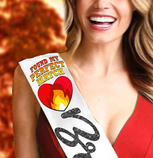 Sparks flew and the bride has found her Perfect Match! Celebrate her at her bachelorette party with our exclusive sash. This premium white satin sash says Found My Perfect Match Bride to Be with black lettering and a colorful icon. The bride will feel extra hot in this amazing sash!