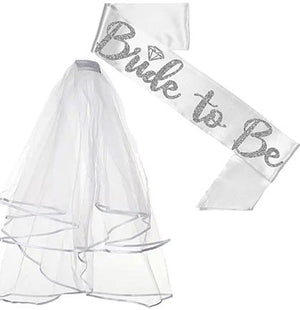 Our most fabulous silver and white bridal set ever! The set includes a silver glitter "Bride to Be" white sash and white tulle veil with white trim. A classic set for the bride for her bridal shower, engagement party, or bachelorette party!
