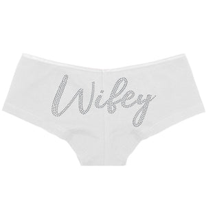This Wifey cheeky panty is a great gift for the bride! Available in white or black, the panty says Wifey on the back in real crystal rhinestones. Makes a fantastic gift for a bridal shower, bachelorette party, lingerie shower, or an anniversary! Wear it during the honeymoon or any time after the wedding!