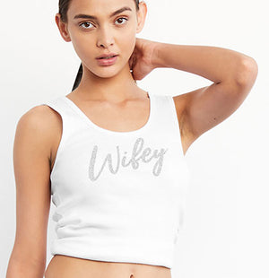 The bride will be thrilled to wear this tank while getting ready the day of her wedding, on her honeymoon, or any time after the wedding. The tank says Wifey in a real crystal rhinestone graphic. Makes a fantastic bachelorette party, bridal shower gift or anniversary gift!